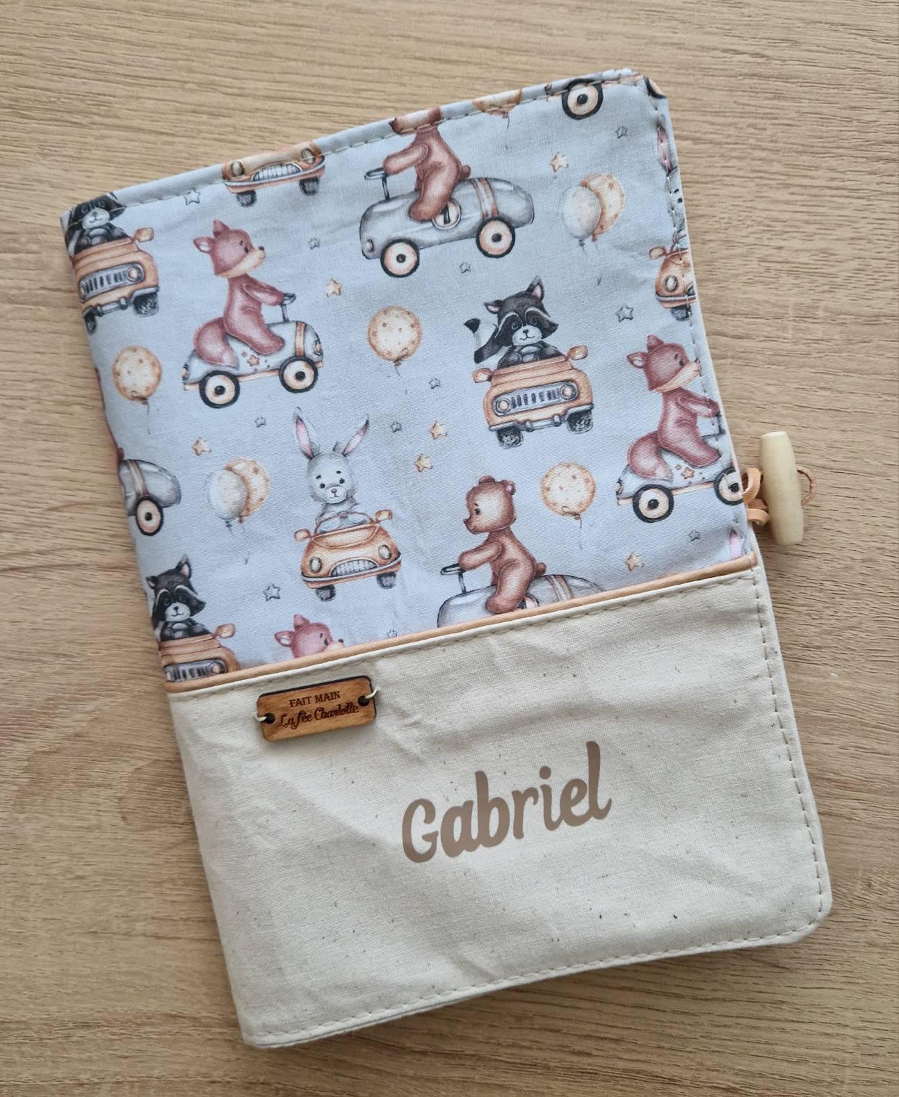 Personalized health record book cover with baby's first name and animal motifs in their vehicles.
